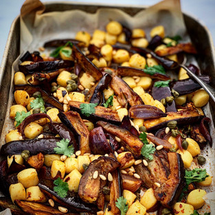 Add the Aubergine and onion to a large roasting pan. Mix the marinade ingredients together in a bowl and drizzle into the tray. Toss the Aubergine and onion to ensure it’s fully coated. If it looks too dry then add more oil. Season generously and into the oven for 35 minutes. Remove from the oven and stir in the fresh gnocchi. Place back in the oven for 10 minutes. Sprinkle with pine nuts and coriander.