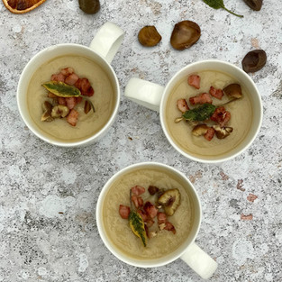 Parsnip Ginger & Cumin Soup Topped with Pancetta & Chestnuts