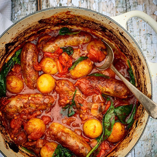 Start by browning the sausages, then set aside. Sauté the onions until golden for a rich flavour. Add the garlic, red pepper, potatoes and paprika. Return the sausages to the pan. Pour in the tomatoes/passata, season and simmer for 1.5 hours mins on a low heat.