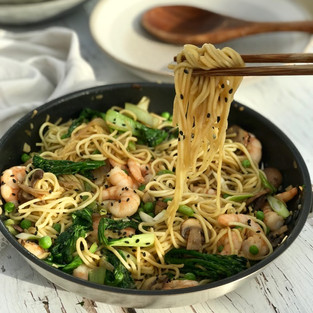 Sauté the onion in oil in a large frying pan. Add the mushrooms, ginger and garlic and stir for a few minutes. Now add the broccoli for 1 minute, followed by the Pak Choi and peas for another minute. Add the sauce ingredients, warm through, then add the prawns and cook until pink. Stir in the noodles and sprinkle with sesame seeds.